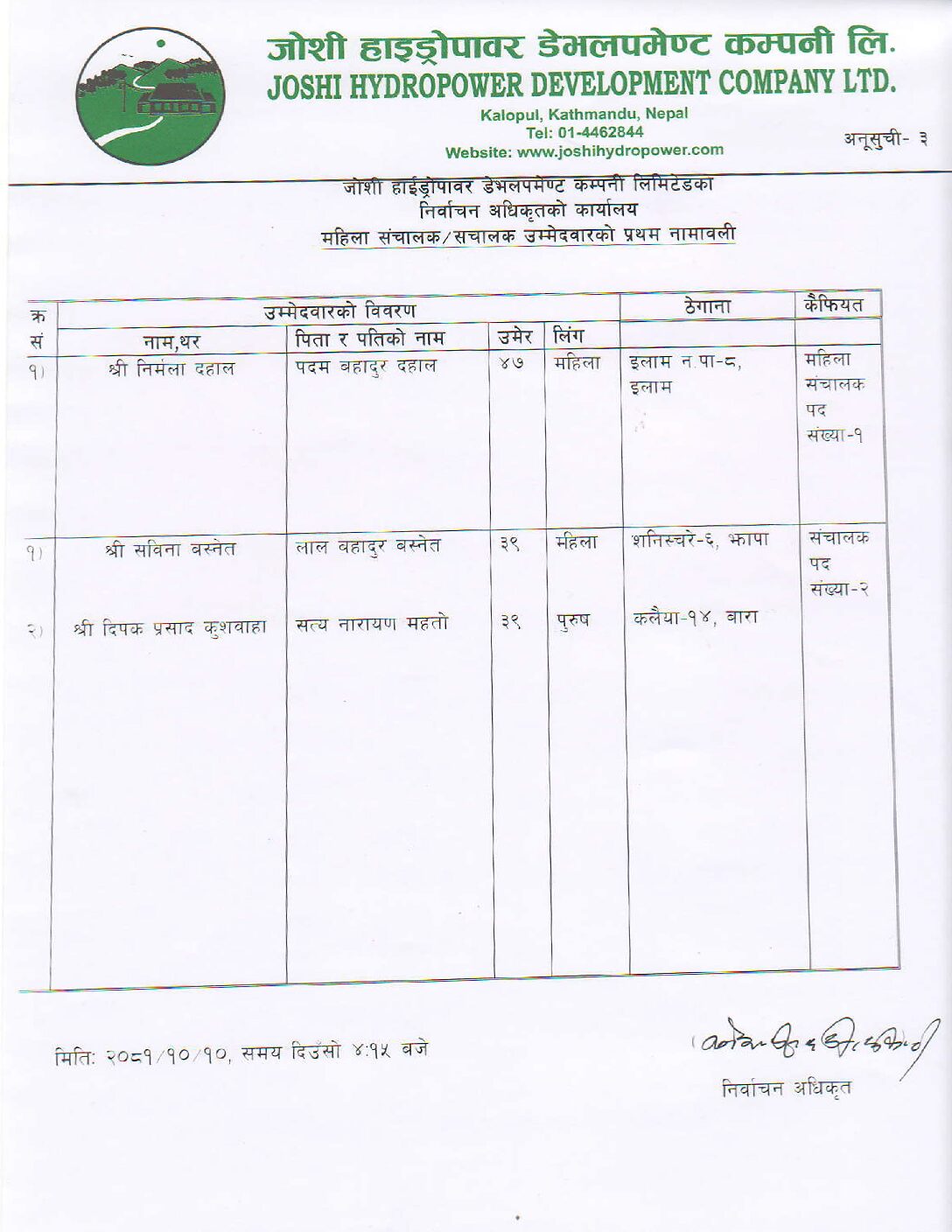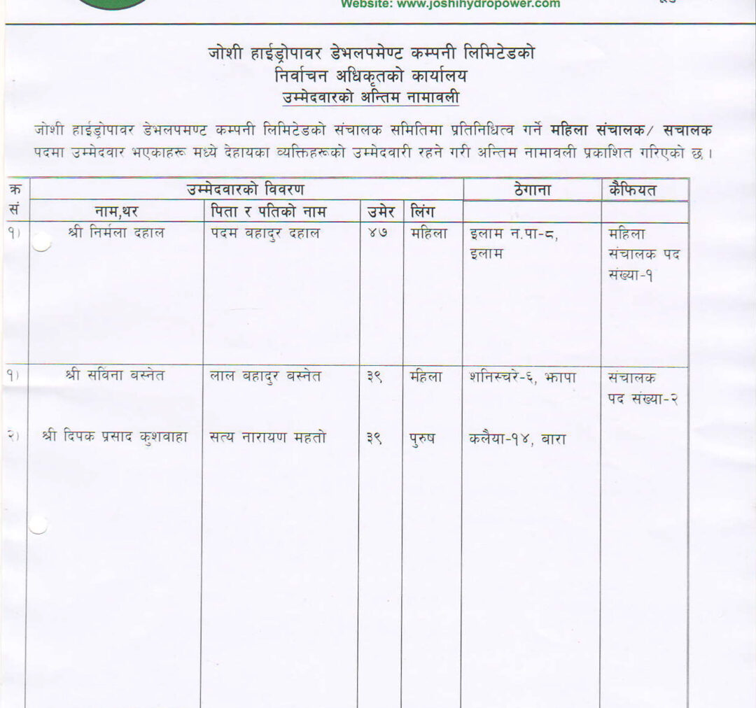जोशी हाईड्रोपावर डेभलपमण्ट कम्पनी लिमिटेडको संचालक समितिमा प्रतिनिधित्व गर्ने महिला संचालक / सचालक पदमा उम्मेदवार भएकाहरू मध्ये देहायका व्यक्तिहरूको उम्मेदवारी रहने गरी अन्तिम नामावली प्रकाशित गरिएको छ ।