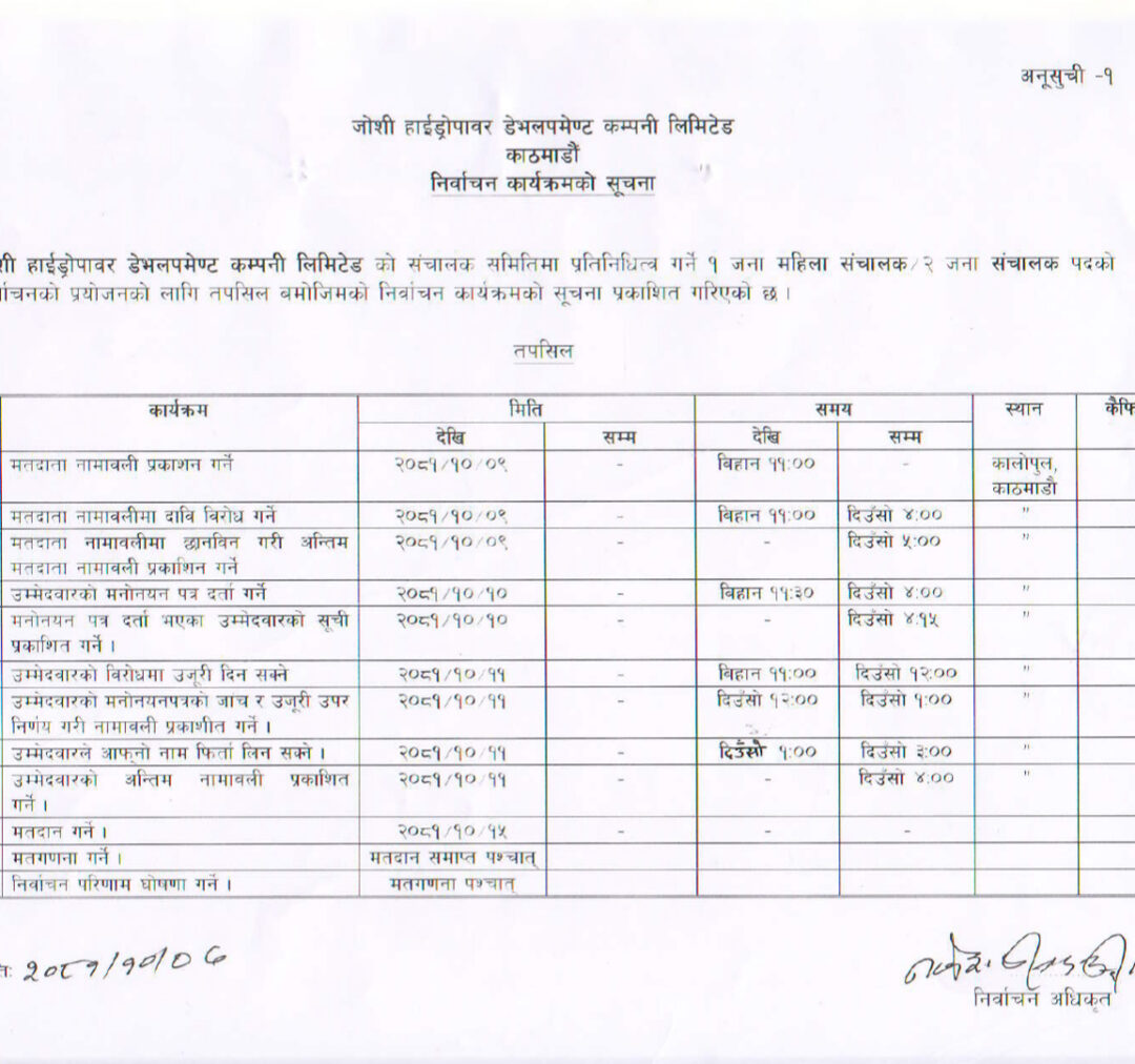 जोशी हाईड्रोपावर डेभलपमेण्ट कम्पनी लिमिटेड को संचालक समितिमा प्रतिनिधित्व गर्ने १ जना महिला संचालक/ २ जना संचालक पदको निर्वाचनको प्रयोजनको लागि तपसिल बमोजिमको निर्वाचन कार्यक्रमको सूचना प्रकाशित गरिएको छ ।