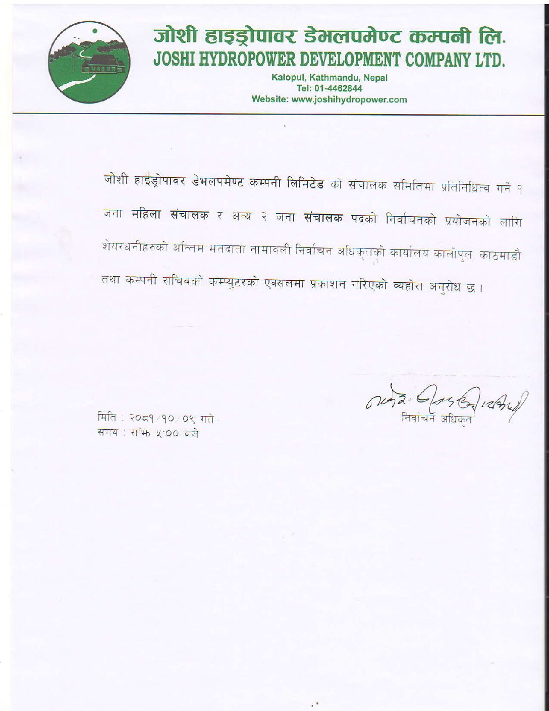 जोशी हाईड्रोपावर डेभलपमेण्ट कम्पनी लिमिटेड को संचालक समितिमा प्रतिनिधित्व गर्ने १ जना महिला संचालक र अन्य २ जना संचालक पदको निर्वाचनको प्रयोजनको लागि शेयरधनीहरुको अन्तिम मतदाता नामावली निर्वाचन अधिकृतको कार्यालय कालोपुल, काठमाडौ तथा कम्पनी सचिवको कम्प्युटरको एक्सलमा प्रकाशन गरिएको व्यहोरा अनुरोध छ ।