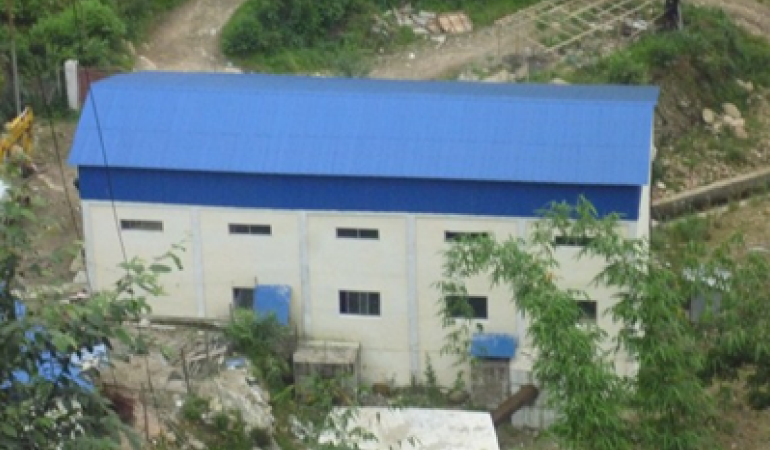 A surface powerhouse has been constructed on the left bank of the Thulo Puwa Khola. The powerhouse lies 25 m upstream of the confluence of two Puwa Khola. It is a reinforced cement concrete structure that houses two horizontal axis generating units. The main machine floor consists of two Francis Turbines, two generators, inlet valves, a maintenance and erection bay. An overhead traveling crane is installed to facilitate the installation and maintenance of powerhouse machines. The powerhouse roofing is of corrugated galvanize iron sheets resting on a steel truss structure seated on reinforced cement concrete column. The floor area of the powerhouse is 336 m2 and its height from the lowest foundation level to the roof ridge is 9.60 m.A row of windows has been provided in the powerhouse for lighting and ventilation. Moreover, a medium sized access door and a large shutter door is provided to transport machine laden trucks. Power station area have been fenced for protection from intruders. The plan and section of the powerhouse are shown in Annex A- As Built Drawing .
